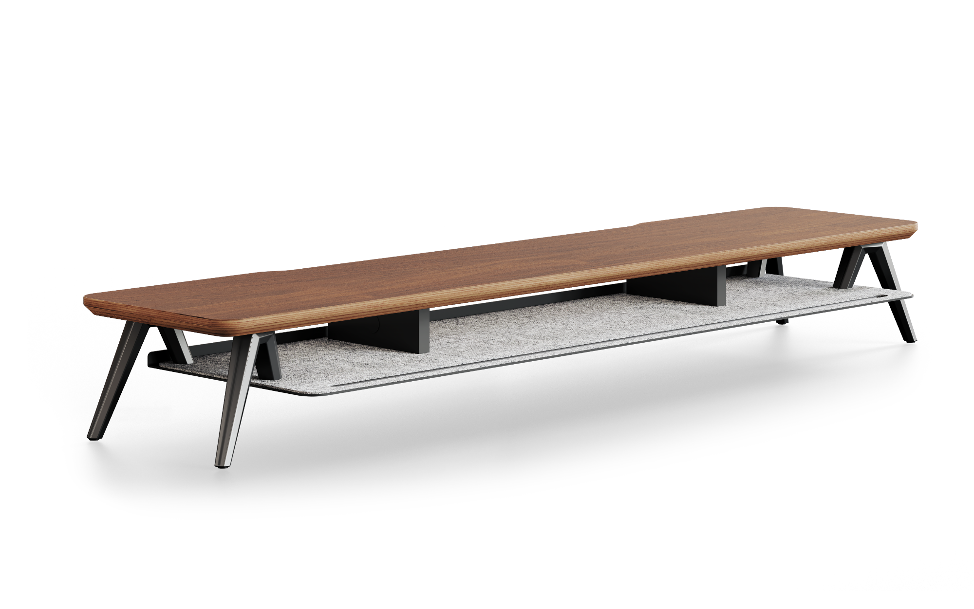 Gebaut für einen starken Auftritt. Erleben Sie die perfekte Balance aus Form und Funktion. Ein Ökosystem in Nussbaum-Optik, das Ihre Bildschirme auf Augenhöhe bringt und gleichzeitig das Potenzial Ihres Schreibtisches erweitert. Getragen von einem robusten M-Rahmen im Industriestil mit einer Tragkraft von bis zu 45 kg. Abgerundet durch eine geräuschdämpfende Filzablage für Ihre täglichen Essentials.